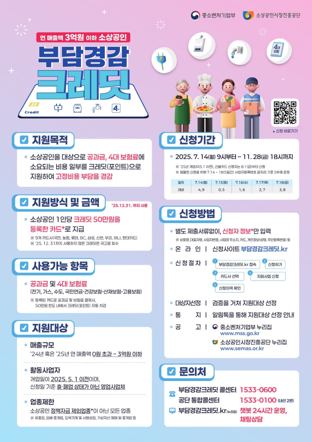 소상공인 4대 사회보험료 지원사업은 연 매출 3억 원 이하 소상공인에게 최대 50만 원까지 사회보험료 부담을 줄여주는 실질적인 지원책입니다. 신청은 2025년 7월부터 11월까지 온라인으로 가능하며, 부담경감크레딧.kr과 소상공인24를 통해 간편하게 진행할 수 있습니다. 지원금은 크레딧 형태로 제공되어 별도의 환급 절차 없이 사회보험료 납부 시 자동 차감되므로 사업주가 바로 혜택을 체감할 수 있습니다. 이번 기회를 놓치지 말고 신청하여 경영 부담을 줄이고, 안정적인 사업 운영에 도움을 받아보시기 바랍니다.