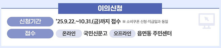 만약 대상자가 아닌 것으로 조회되더라도 이의신청 절차가 있습니다. 혼인, 출산, 소득 변동 등으로 기준 이후 가구 구성이나 소득 상황이 달라진 경우 국민신문고나 주민센터를 통해 이의신청이 가능합니다. 이의신청은 9월 22일부터 10월 31일까지 접수할 수 있습니다.