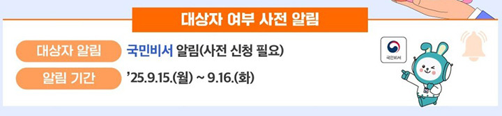 본인이 대상자인지 가장 빠르게 확인할 수 있는 방법은 국민비서 알림 서비스를 이용하는 것입니다. 네이버앱, 카카오톡, 토스, 국민비서 누리집에서 신청할 수 있으며, 신청해 두면 지급대상 여부, 신청기간, 사용기한 등 맞춤형 안내를 받을 수 있습니다. 이미 1차 때 신청했다면 별도 신청 없이 2차 관련 정보도 제공됩니다.