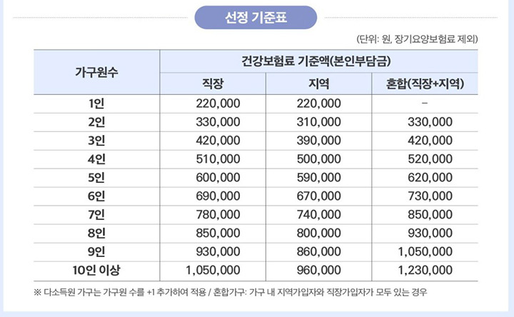 1인 가구는 직장가입자 기준 연소득 약 7500만 원 수준까지 지원되며, 맞벌이와 같이 소득원이 2인 이상인 다소득원 가구는 가구원 수를 1명 추가한 기준을 적용합니다. 이를 통해 청년 단독 가구나 고령층 1인 가구가 불리하지 않도록 형평성을 반영했습니다.