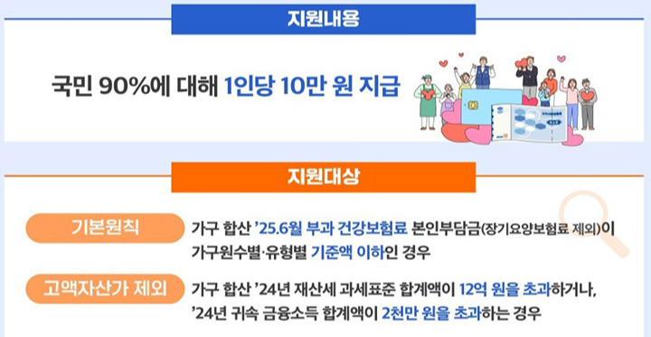 이번 지원에서 가장 중요한 부분은 누가 대상자가 되는가입니다. 정부는 2025년 6월 기준 건강보험료 부과액을 중심으로 소득 하위 90%를 선별하고, 고액자산가를 제외하는 방식을 적용합니다.