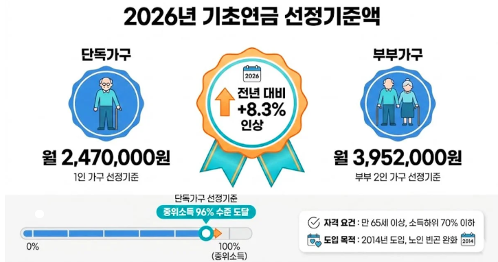 고령층의 생활 안정과 기본적인 노후 소득 보장을 위해 운영되는 대표적인 제도가 바로 기초연금입니다. 매년 정부는 노인의 소득과 재산 수준, 물가 상승률, 생활 실태 등을 종합적으로 고려해 기초연금 선정기준액을 조정하고 있으며, 2026년도 기준 역시 이러한 흐름 속에서 새롭게 결정되었습니다. 보건복지부는 2026년 기초연금 선정기준액을 확정해 발표했으며, 이에 따라 새해부터는 노인 단독가구의 경우 월 소득인정액이 247만 원 이하, 부부가구는 395만 2천 원 이하이면 기초연금을 받을 수 있게 됩니다. 이는 전년도 대비 상당 폭 인상된 수치로, 노인 가구의 전반적인 소득·자산 상승 상황이 반영된 결과입니다.