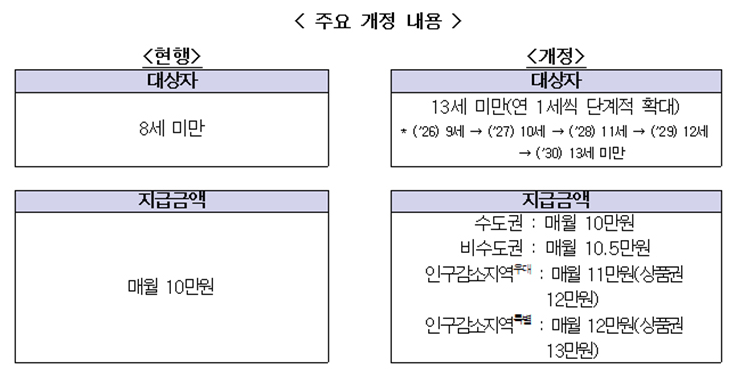 특히 이번 개정안에는 아동수당 지급대상 확대뿐만 아니라 지방 거주 아동에 대한 추가지원 정책도 포함되어 있습니다. 비수도권과 인구감소지역 아동에게는 매월 최대 2만 원의 추가 지원이 제공될 예정입니다. 이는 지역 균형 발전과 저출산 대응 정책의 일환으로 추진되는 제도입니다.