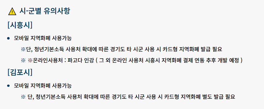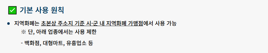 경기도 청년기본소득은 지역화폐 형태로 지급되기 때문에 사용 가능한 장소가 일정 부분 제한됩니다. 기본적으로는 주민등록상 주소지에 해당하는 시군의 지역화폐 가맹점에서 사용할 수 있습니다.