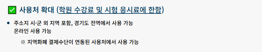 다만 대형마트나 백화점, 일부 프랜차이즈 직영점 등에서는 사용이 제한될 수 있습니다. 또한 온라인 쇼핑몰의 경우 일반적인 결제는 제한되지만 학원 수강료나 시험 응시료와 같이 교육 목적의 지출은 경기도 내에서 시군 제한 없이 사용 가능한 경우도 있습니다.