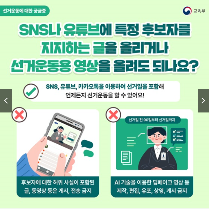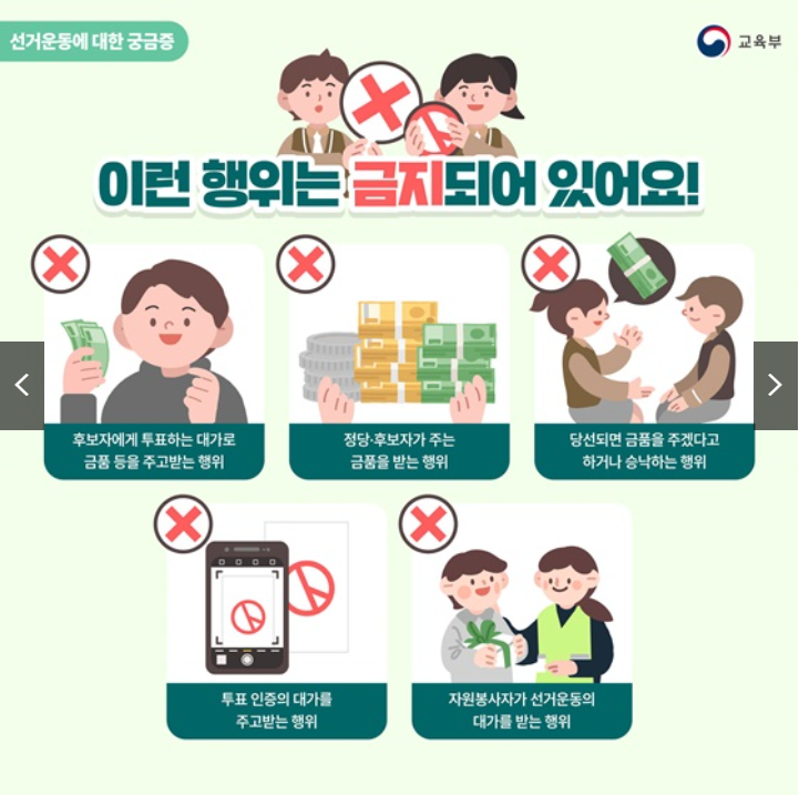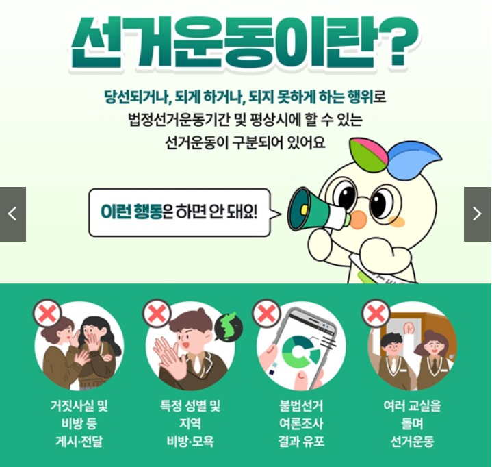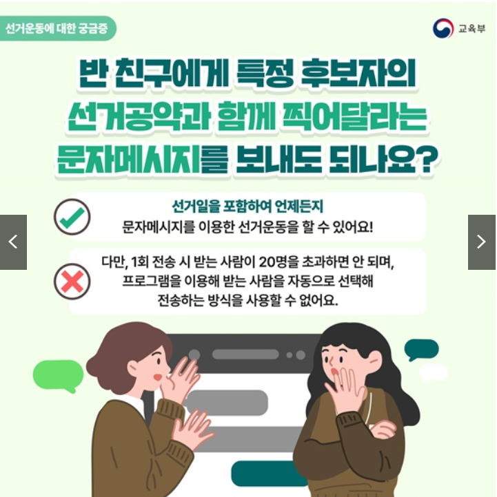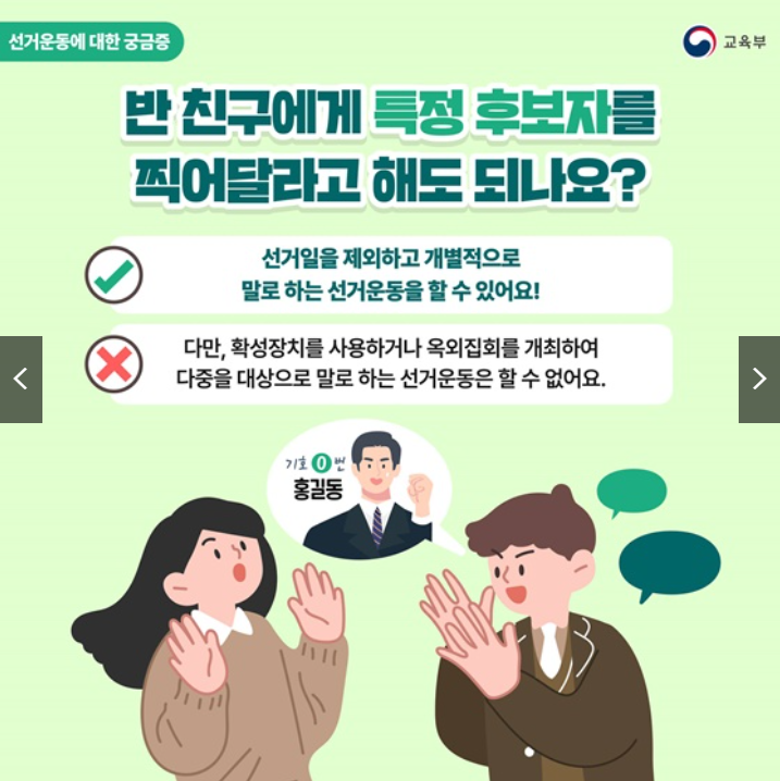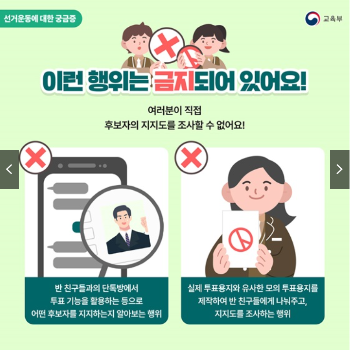 - 교복 입고 선거운동은 권장되지 않음 (학생 신분 드러나는 행위는 주의)