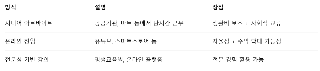 노년기에도 일을 지속하는 분들이 많아졌습니다. 특히 60~70대에도 시간제 근무, 창업, 프리랜서 활동 등 다양한 방식으로 활동이 가능합니다.