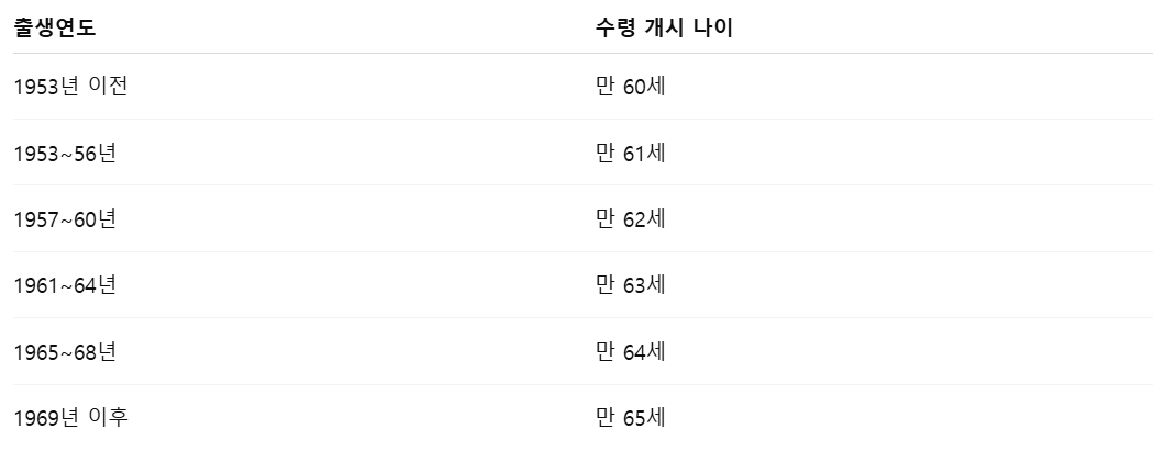 - 노령연금: 만 60세 이상(출생연도에 따라 만 65세까지 상향)부터 수령 가능