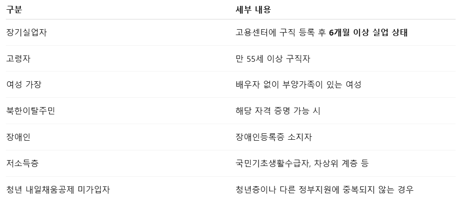 고용촉진장려금은 다음 요건에 해당하는 취업 취약계층을 대상으로 합니다.