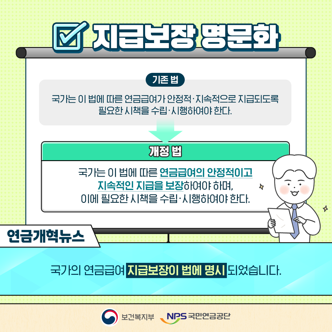 즉, 현재 논의 중인 보험료율 인상, 수급개시연령 상향, 소득대체율 조정 등의 핵심 사안들도 국민연금법 개정을 통해 법제화되어야만 효력을 갖게 됩니다.