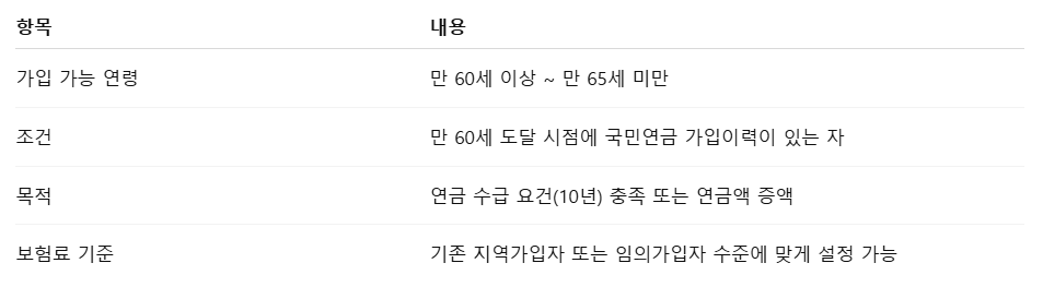만 60세 이후에도 국민연금 보험료를 계속 납부할 수 있도록 허용하는 제도입니다.