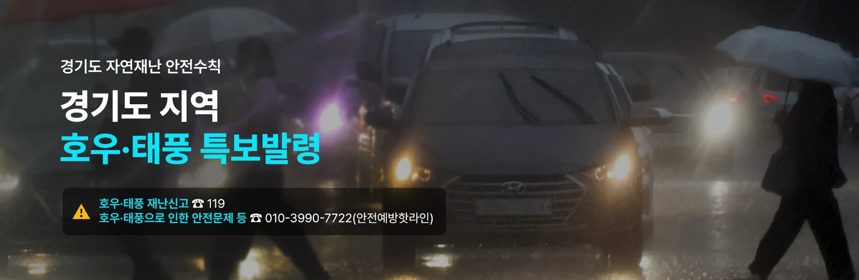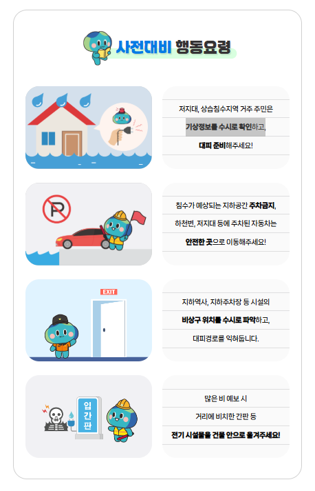 - 특히 지하주차장, 하천 인근 주차장, 저지대 도로변에 주차한 차량은 침수 위험이 높으므로 가급적 고지대 주차를 생활화해야 합니다.