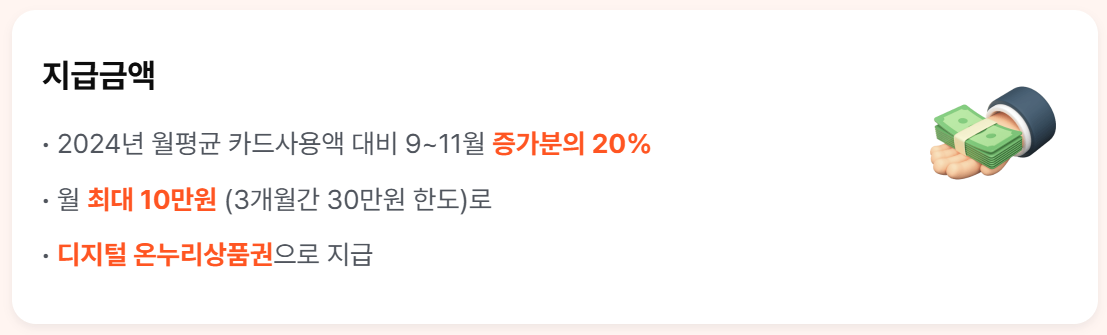 인정 기간은 ‘지급 기준 기간’과 ‘신청 기간’으로 나뉜다. 지급 기준이 되는 소비는 2025년 9월·10월·11월 카드 이용액이며, 각 월의 ‘2024년 본인 월평균’ 대비 증가한 금액의 20%를 산정한다. 월별 한도는 10만 원, 3개월 합산 최대 30만 원이다. 지급 수단은 디지털 온누리상품권으로 고정되어 있으며, 9월분은 10월 15일, 10월분은 11월 15일, 11월분은 12월 15일에 지급된다.