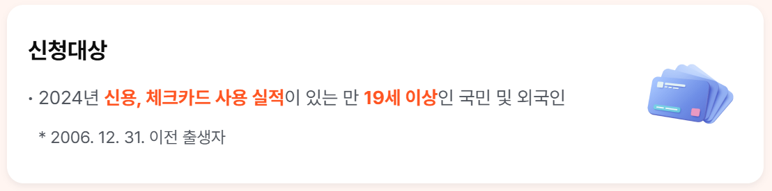 가장 먼저 확인해야 할 것은 대상과 인정 기간, 그리고 계산 방식이다. 상생페이백은 만 19세 이상(연말 기준 2006년 12월 31일 이전 출생)으로, 2024년에 신용·체크카드 사용 실적이 있는 대한민국 국민 및 외국인이 신청할 수 있다. 즉 작년 카드 사용 이력이 있어야 ‘올해 늘어난 소비’를 비교하여 산정할 수 있다.